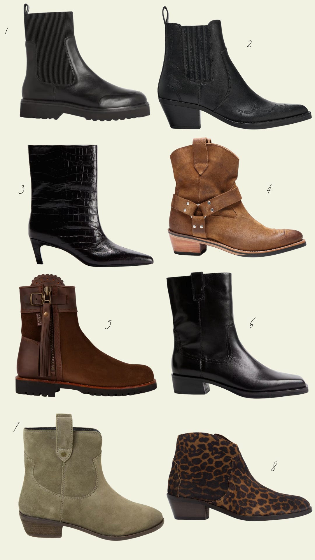 1.Purcie boots, John Lewis £89; 2. Cowboy boots, Zara £79.99; 3. Ankle boots, H&M £119.99; 4. Tammy suede, Grenson £152 (Sale); 5. Tassel boot, Penelope Chilvers £379; 6. Chisel toe boot, M&S £76; 7. Remi Khaki boot, FatFace £79; 8. Suede leopard, Anonymous Copenhagen £250.