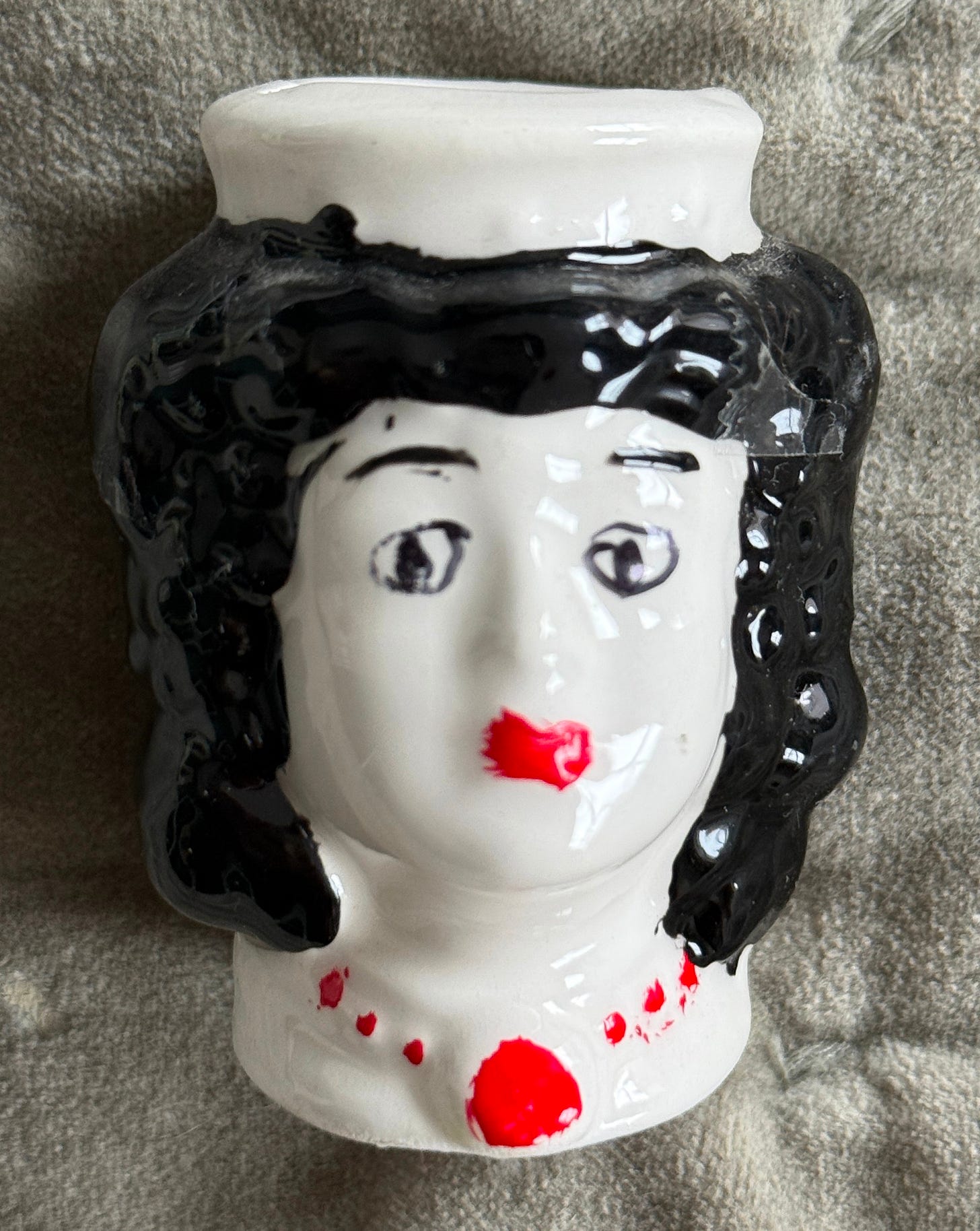 A tile. I looked for ages for some traditional tiles I could use as a backsplash in the new kitchen but to no avail, but I did find one with a dog on. Also, there were loads of Sicilian heads wherever you looked but they were pricey, so I managed to find a mini candleholder for five euro that I’m going to stick a paper on the bottom of and use for matches.